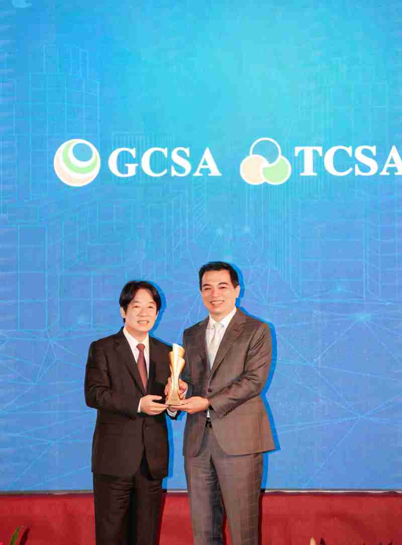 达全方位永续表现获全球永续奖及台湾永续奖肯定,,,,由副总统赖清德颁奖 (左),,彩神vll总经理柯富仁 (右) 代表领奖