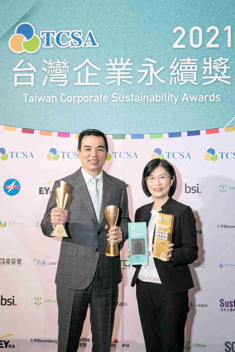 达在台湾永续奖所评比环境、、、社会、、治理等各面向的永续绩效均获高度肯定 (左:彩神vll光电总经理暨营运长柯富仁,,,右:彩神vll光电永续长古秀华)