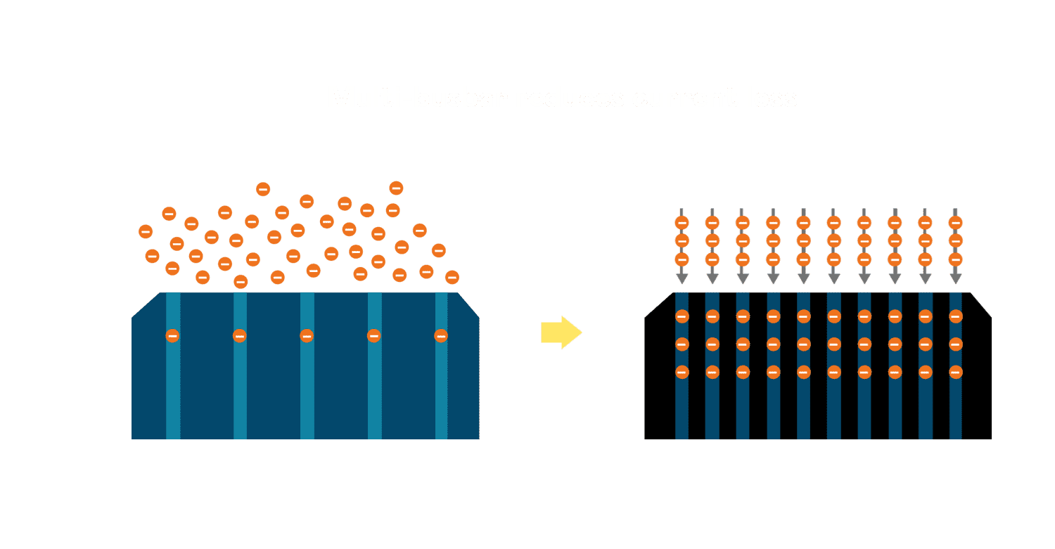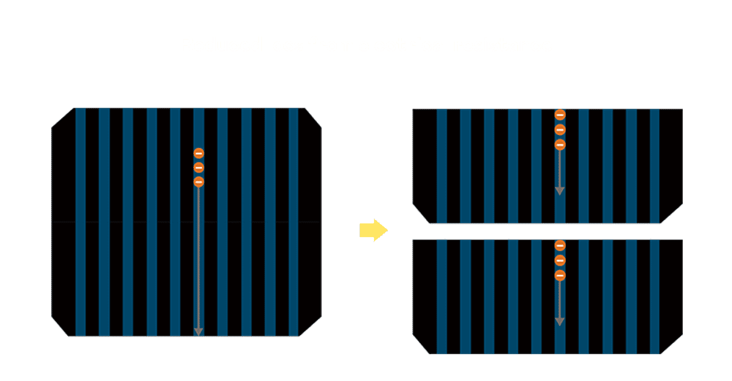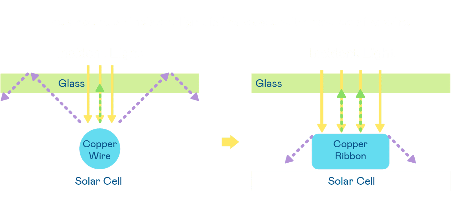• 电池使用多条铜导线 (Copper wire) 于电池片上形成较短的电流路径,,提高电流收集效率,,采用圆形设计的铜导线较传统扁平式的铜焊带 (Ribbon),,可增加入射至电池的光线量。。